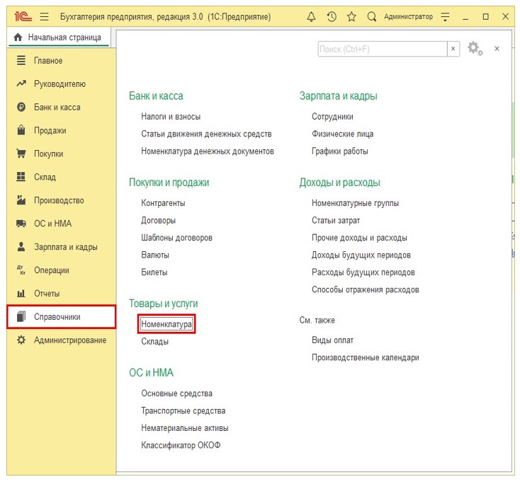 Шаг 1. Откроем справочник «Номенклатура» (раздел «Справочники» – «Номенклатура»).