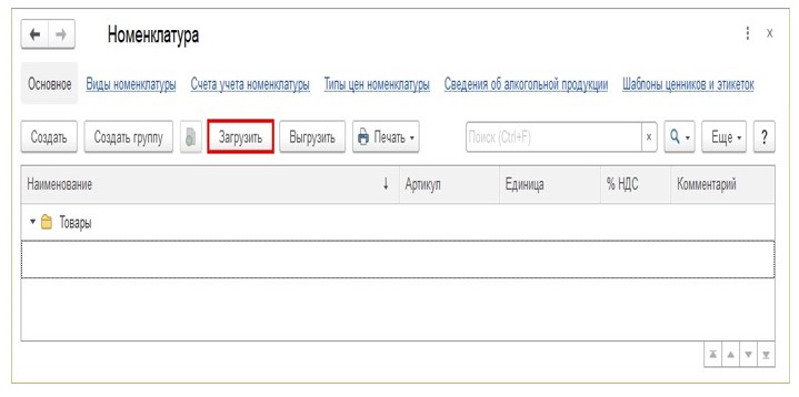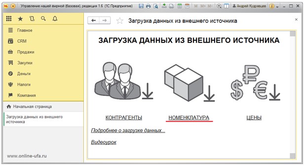 Шаг 1. Открываем обработку для загрузки (раздел «Компания» – «Загрузка данных из внешнего источника» – «Номенклатура»).