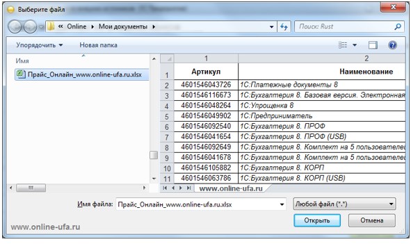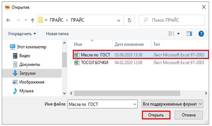 Шаг 3. Выбираем документ Excel со списком номенклатурных позиций, которые хотим загрузить, и нажимаем кнопку «Открыть».