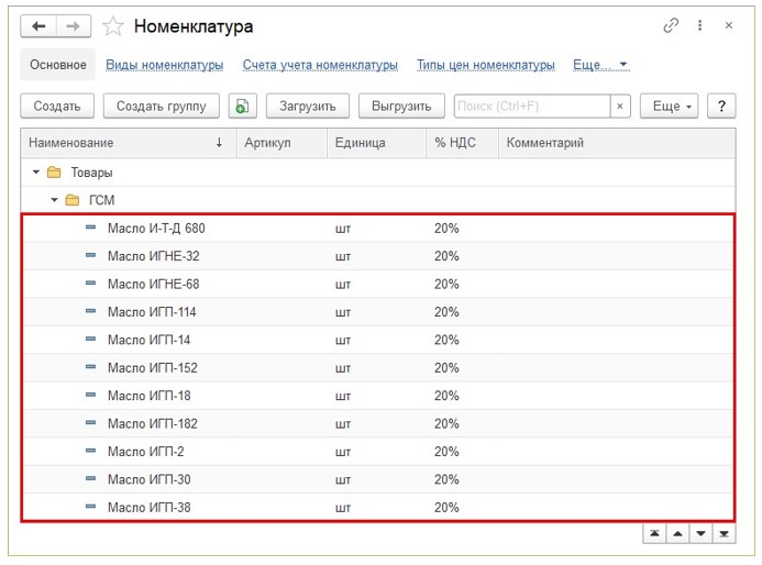 При верном заполнении «1С:УНФ» загрузит из документа перечень товаров и создаст новые элементы в указанной группе справочника «Номенклатура».