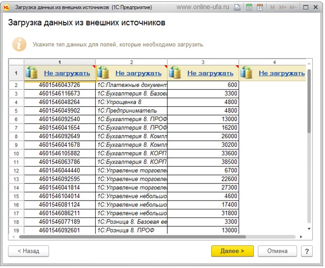 Шаг 2. На данном шаге нам необходимо определить наименования колонок, для этого жмем на ссылку «Не загружать» вверху каждой колонки и в открывшемся окне выбираем верный реквизит, как мы делали на предыдущем этапе.