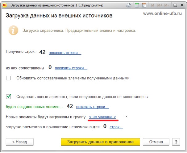Если данные загружаем в пустой справочник, то выбираем параметр «Создавать новые элементы, если полученные данные не сопоставлены», а параметр «Обновлять сопоставленные элементы полученными данными» наоборот не выбираем.