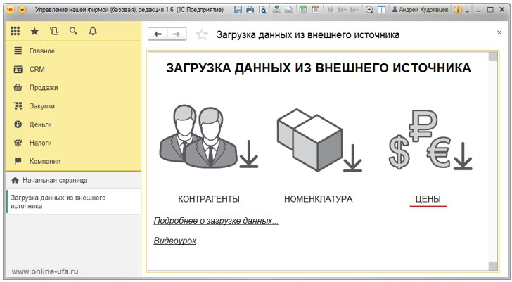 Шаг 1. Открываем обработку для загрузки (раздел «Компания» – «Загрузка данных из внешнего источника» – «Цены»)