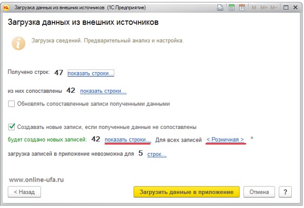 Если нажать на «показать строки», то можно более детально посмотреть, какие пункты будут загружены.