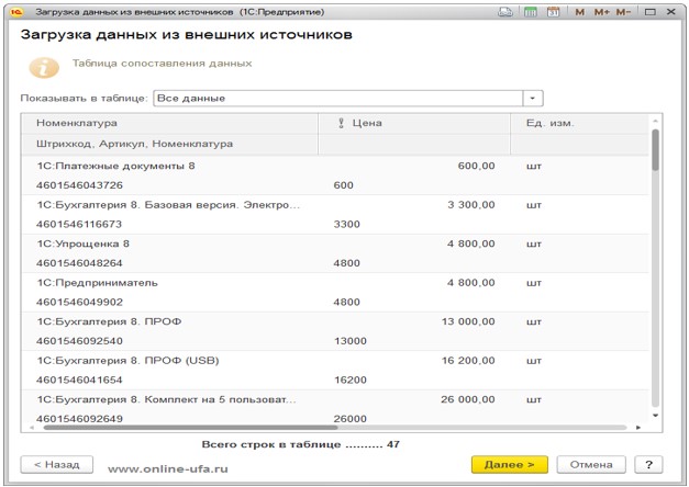После прочтения документа в табличной части окна «Загрузка данных из внешних источников» будет показан перечень товаров с данными.