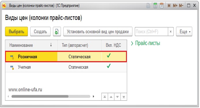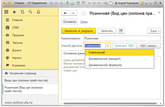 Если данного типа цен еще нет, то нажимаем на кнопку «Создать», в наименовании цены пишем, например, «Розничная», способ расчета выбираем «Статический», уточняем каким образом в цене будет рассчитываться НДС.