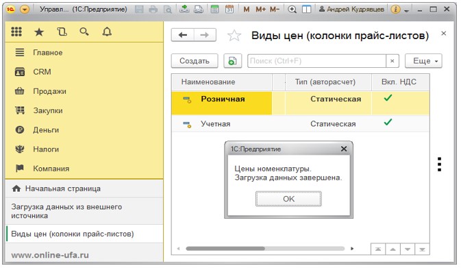 Тут же необходимо указать, какой тип цен будет загружаться.
