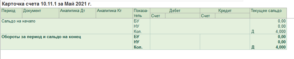 Экспресс-проверка ругается на сч. 10.11.1, мол количество там есть, а стоимости нет. Вроде нормально: стоимость списалась (самортизировала), а вещь продолжает использоваться. Но всё же карточка счёта выглядит несколько странно... Может надо как-то убрать это количество со счета?