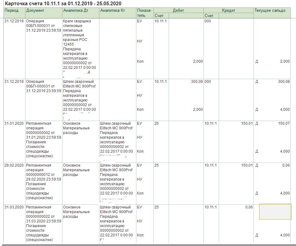 Подскажите пожал. как мне посмотреть остаточную стоит-ть спецодежды, не могу сделать возврать, пишет что не списана, значит я должна сделать проводки и посчитать вручную все. Какими проводками воспользоваться? ДТ 10.10 КТ 10.11? А ДАЛЬШЕ КАК???