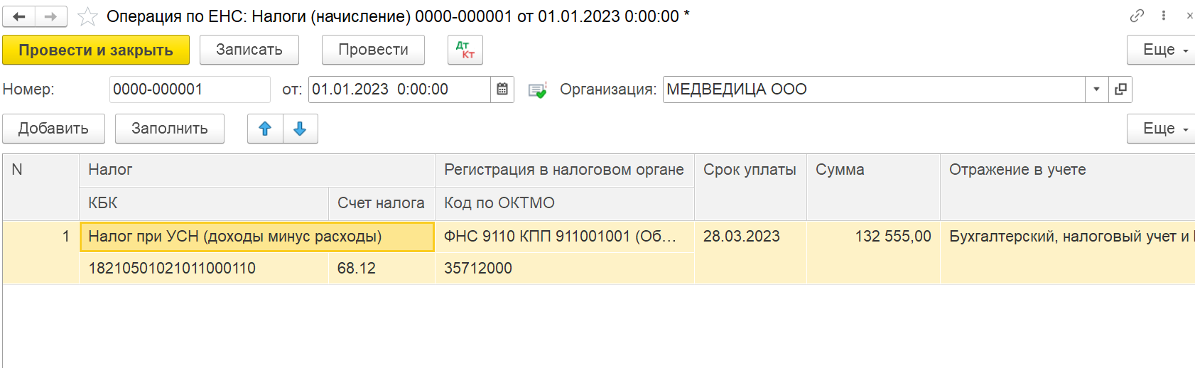 Зашла: Операции - ЕНС - Операции по счету. Создала операцию по счету 68.12.