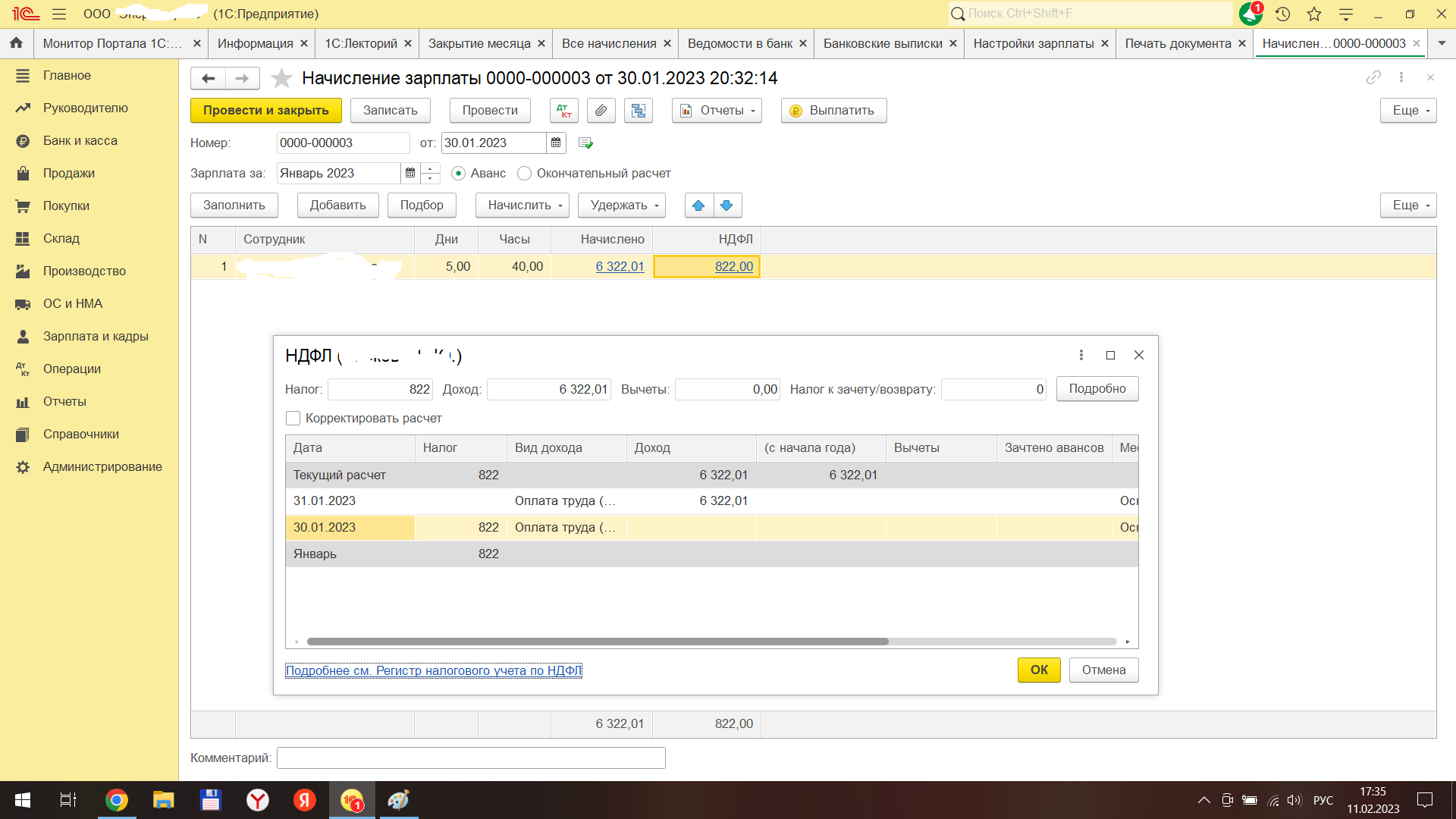 По сотруднику, по которому прилагаю скрины в начислении з/п окончательной, в расшифровке НДФЛ откуда-то взялась дата 02.02.2023 и ндфл (-821).