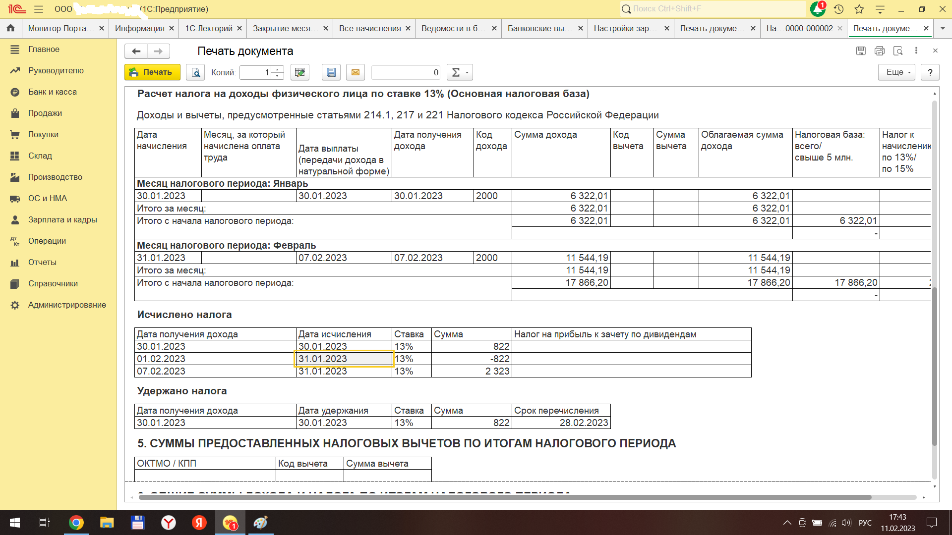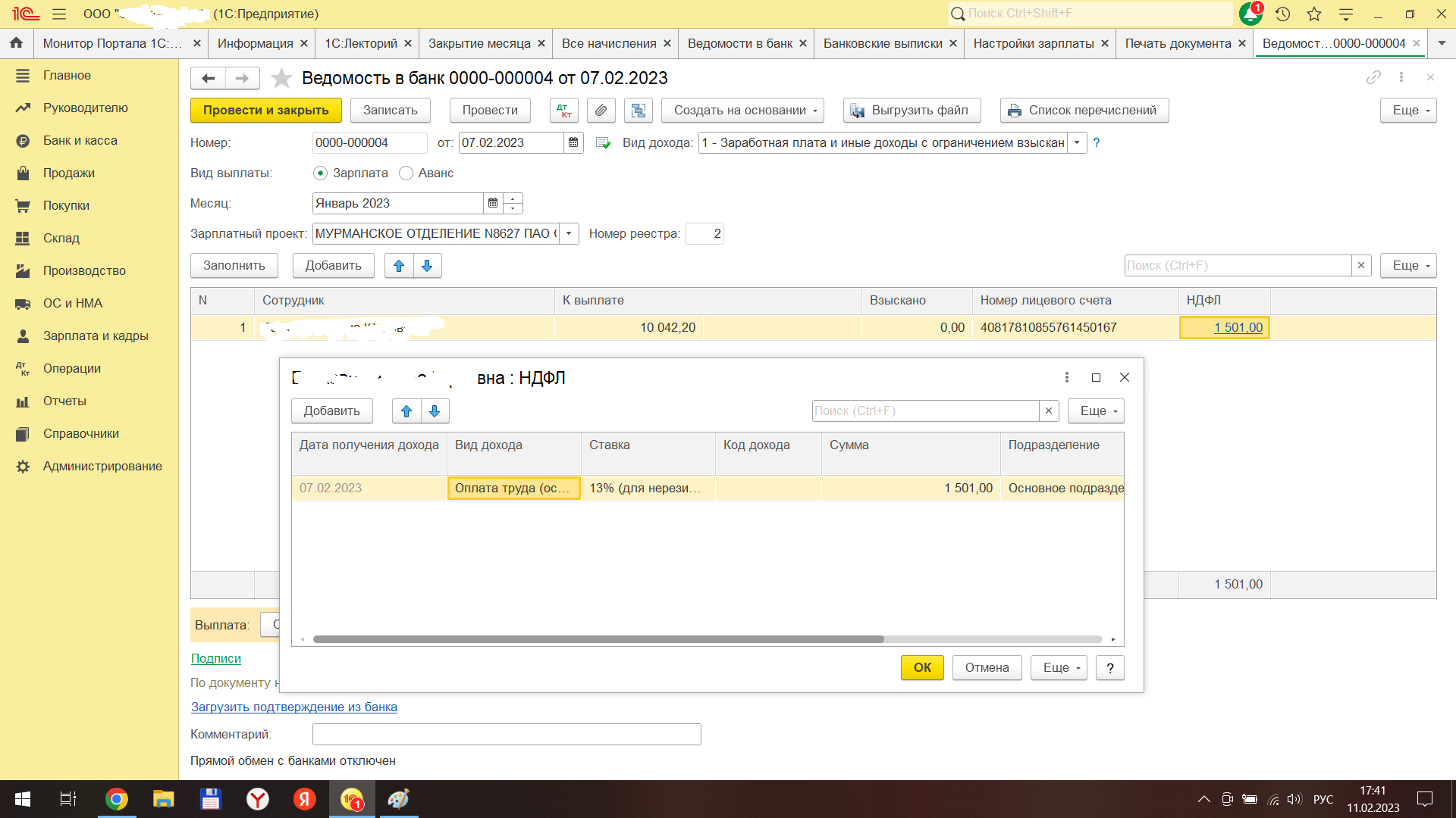Сделан окончательный расчет, дата выплаты указана 07.02.2023, ндфл расчитан за январь 2323. Делаю ведомость 07.02.2023 на остаток з/п января и рассчитывается ндфл за целый месяц 2322, а не остаток 1501. И почему 2322, а не 2323?