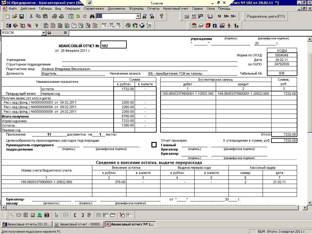 Я провожу авансовый отчет. В табличке на первой странице ввожу остаток на начало месяца – 1732 руб., ввожу 3 расх.орд.(фонд.) на сумму 6780 руб. Получено, израсходовано программа считает сама. Остаток показывает 1280 руб., на 2-й стр в конце а/о показывает остаток 904 руб. В таблице «Сведения о внесении остатка, выдаче перерасхода» отражается запись о внесении остатка на сумму 376 руб.