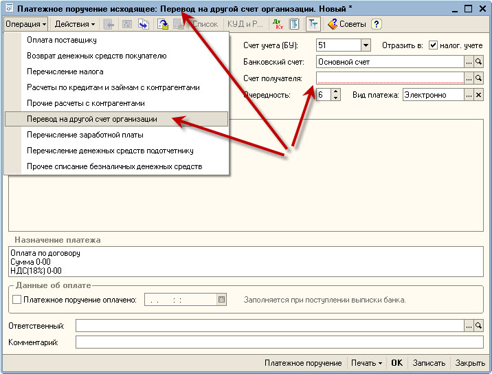 Я делаю платежное поручение исходящее - операция - перевод на другой счет - в счете получателя в списке есть только счета банка отправителя, других нет. Может я что-то не так деляю?