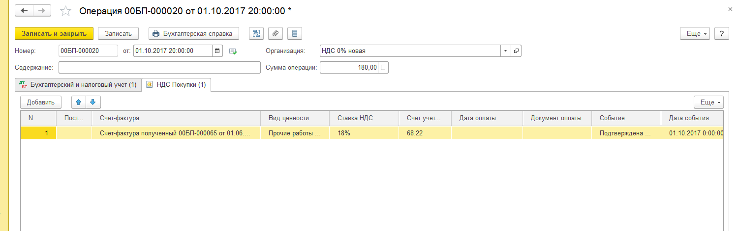 Добрый вечер. Бьюсь над этой проблемой уже 1 мес. Пробовала и так и эдак. Перерыла все методики. В книгу покупок вычет залетает в двойном размере, причем одна строка на полную сумму без указания контрагента и документа основания. Эта ошибка не дает заполниться корректно декларации. Подскажите у кого получилось провести в программе данные операции.