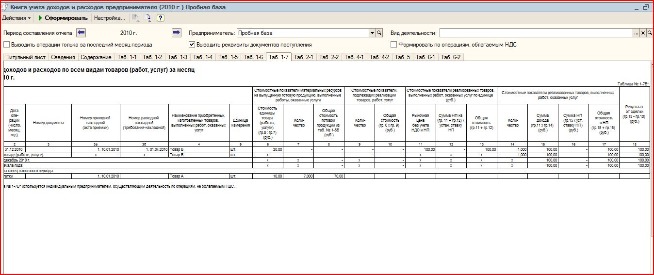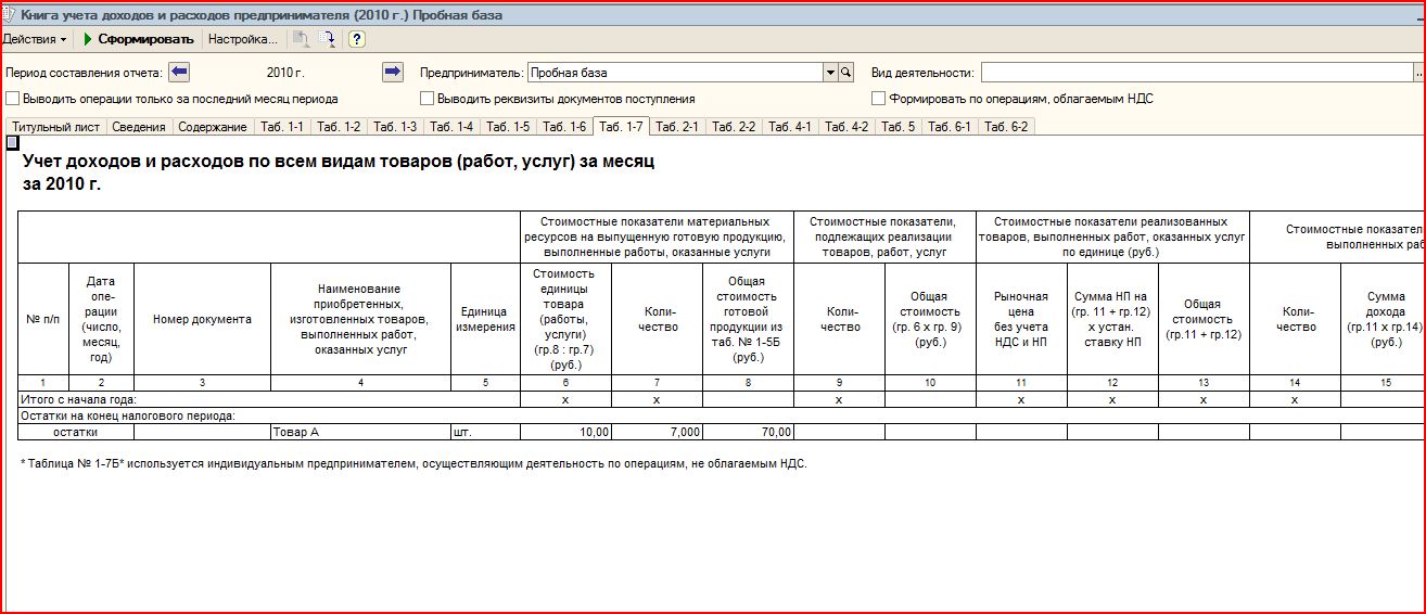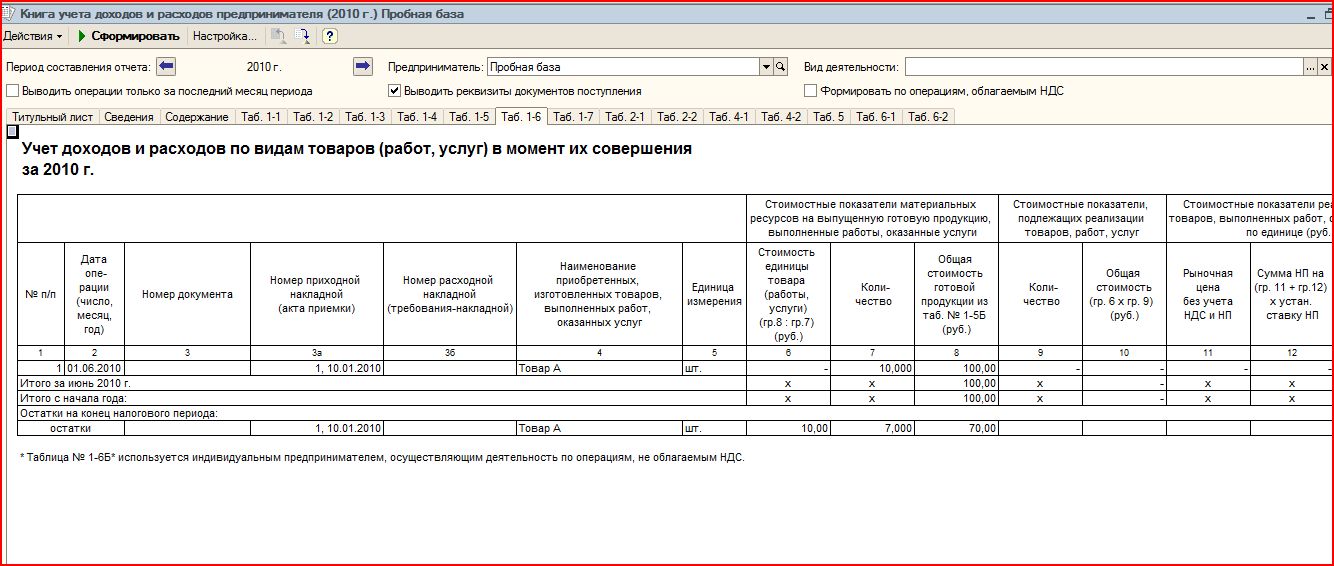 После оприходования товара А и Б 10.01.2010 г. и после реализации 01.04.20120 г. в Книге ДиР ничего не отобразилось. А вот после оплаты поставщику заполнились следующие листы А после того, как прошла оплата от покупателя, получилось следующее таблица 1-1 не изменилась, а остальные таблица стали такими И появился доход