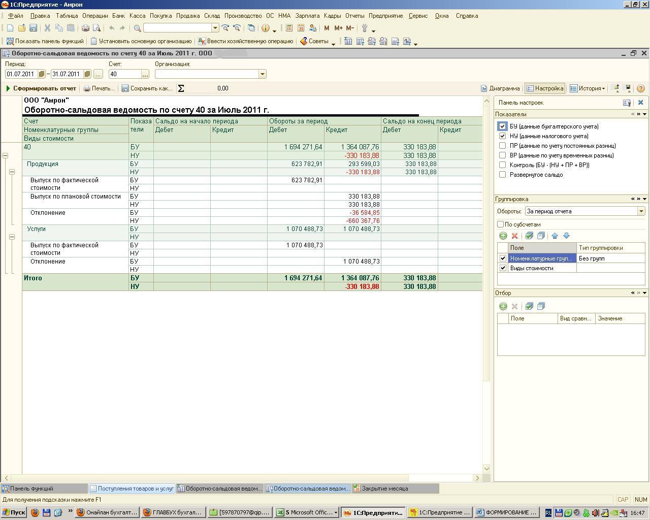 Фирма занимается производством. Производим детальки из металла. В течение месяца для изготовления деталек списываем на производство металл. Для каждого заказа, для каждой позиции, т.е. металл уходит попозиционно. Согласно учетной политики, используем счет 40.