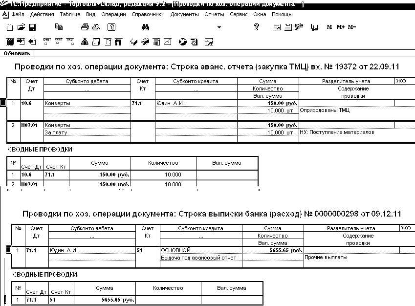 торможу. в торговле и склад делала авансовый отчет. долг перед сотрудником получается 5000. кинула платежку в банк на перечисление долга на пластиковую карту подотчетника. долг так и остался висеть.