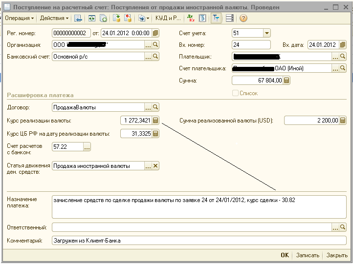 По умолчанию Поступление на р-сч по сделке продажи валюты 1С 8.2 БП 2.0 (УСН)