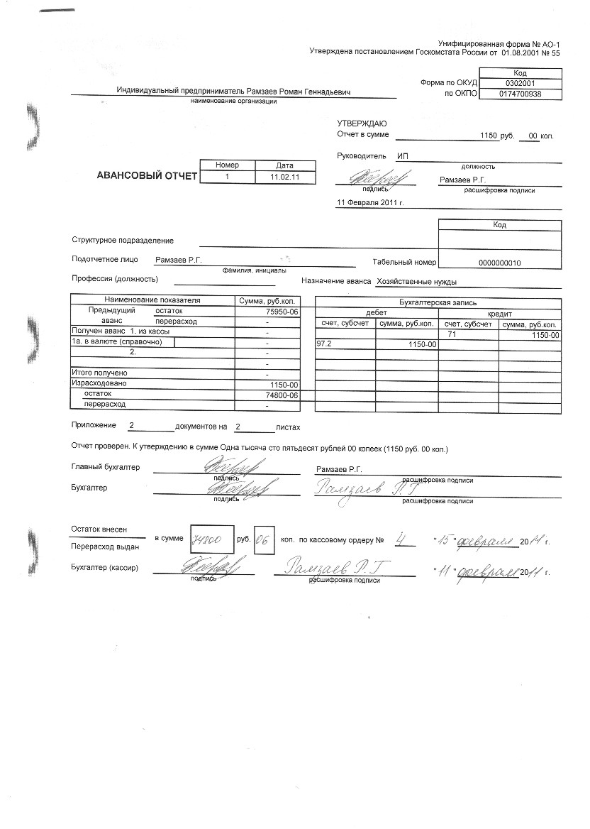 Добрый день! Подскажите пожалуйста. Вопрос в следующем. Приказам закреплено, что деньги в под отчет выдаются на 3 месяца, после чего по ним необходимо отчитаться. Подотчетное лицо получило деньги 30.01.11, аванс.отчет предоставил 11.02.11, но израсходована не вся сумма. Может ли он внести остаток ден.ср-в позже? (ведь изначально это сумма выдавалась на три месяца)? Правильно оформлен авансовый отчет?