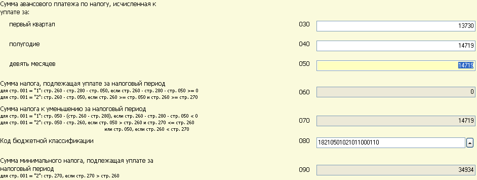 Расход 3,452,822 Разница 40552 *15% = 6083 (налог) 1 кв. исчислено 13730 оплачено 13730 2 кв исчислено 14719 оплачено 989 р. 3 кв. исчислено 15344 (ничего не платили) Получается , что надо платить минимальный налог 3,493,374*1% = 34934 Вопрос: что указать по строке 050 (девять месяцев), 060 (сумма налога подлежащая уплате) Минимальный налог платить полностью или можно уменьшить на авансовые платежи |