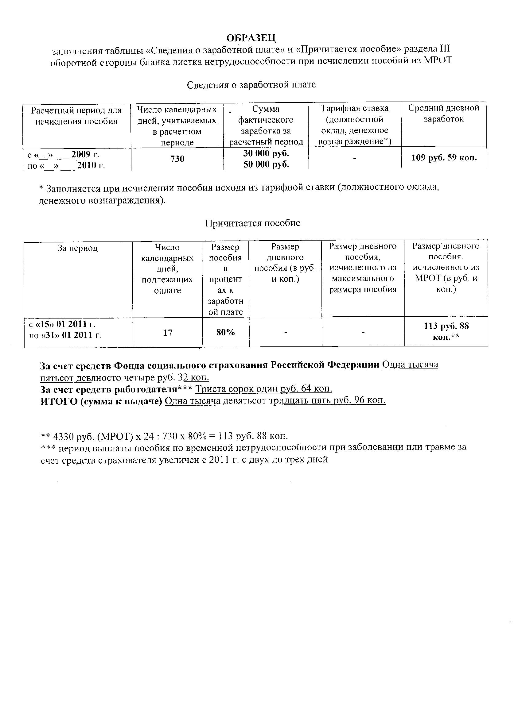 ПИСЬМО от 24 декабря 2010 г. N 02-03-10/05-14557 ОБ ОФОРМЛЕНИИ ОБОРОТНОЙ СТОРОНЫ БЛАНКА ЛИСТКА НЕТРУДОСПОСОБНОСТИ С 1 ЯНВАРЯ 2011 ГОДА В связи с вступлением с 1 января 2011 года в силу Федерального закона от 8 декабря 2010 года N 343-ФЗ "О внесении изменений в Федеральный закон "Об обязательном социальном страховании на случай временной нетрудоспособности и в связи с материнством" (далее - Федеральный закон от 08.12.2010 N 343-ФЗ), Фонд социального страхования Российской Федерации (далее - Фонд) сообщает. Федеральный закон от 29 декабря 2006 года N 255-ФЗ "Об обязательном социальном страховании на случай временной нетрудоспособности и в связи с материнством" в редакции Федерального закона от 08.12.2010 N 343-ФЗ предусматривает новый порядок исчисления пособий по временной нетрудоспособности, по беременности и родам, о чем региональные отделения Фонда были проинформированы письмом от 14.12.2010 N 02-03-17/05-13765 "О направлении Федерального закона от 08.12.2010 N 343-ФЗ". Так, с 1 января 2011 года указанные пособия будут рассчитываться исходя из среднего заработка застрахованного лица за два календарных года, предшествующих году наступления страхового случая, вместо ранее применяемого годичного расчетного периода. Вместе с тем бланк листка нетрудоспособности, форма которого утверждена Приказом Министерства здравоохранения и социального развития Российской Федерации от 16 марта 2007 года N 172 "Об утверждении формы бланка листка нетрудоспособности", не предусматривает строки для внесения сведений о заработной плате за два календарных года. Кроме того, изменен порядок определения среднего дневного заработка, отменена норма об исчислении пособий из должностного оклада (тарифной ставки, денежного вознаграждения) при отсутствии у застрахованного лица в расчетном периоде заработка. С учетом изложенного, рекомендуем таблицу "Сведения о заработной плате" раздела III оборотной стороны бланка листка нетрудоспособности заполнять следующим образом: в столбце "Расчетный период для исчисления пособия" отражать период учета заработка, указывая соответствующие календарные годы. Например, в одной строке указать "2009 год", ниже "2010 год"; в столбце "Число календарных дней, учитываемых в расчетном периоде" во всех случаях указывать "730"; в столбце "Сумма фактического заработка за расчетный период" указывать сумму заработка, иных выплат и вознаграждений в пользу застрахованного лица, на которые начислены страховые взносы на обязательное социальное страхование на случай временной нетрудоспособности и в связи с материнством (далее - страховые взносы), за каждый календарный год, указанный в столбце "Расчетный период для исчисления пособия". За период до 1 января 2010 года, а для лиц, работающих по трудовым договорам у страхователей, применяющих специальные налоговые режимы, - за период до 1 января 2011 года в данном столбце указывается сумма заработка, иных выплат и вознаграждений, на которые начисляются страховые взносы, за каждый календарный год, указанный в столбце "Расчетный период для исчисления пособия". При этом сумма заработка, иных выплат и вознаграждений не должна превышать за каждый календарный год предельную величину базы для начисления страховых взносов в Фонд (за 2009 и 2010 годы предельная величина базы составляет 415 000 рублей за каждый год); столбец "Тарифная ставка (должностной оклад, денежное возна