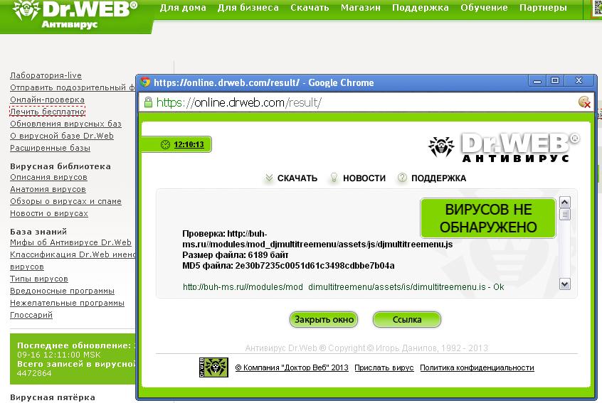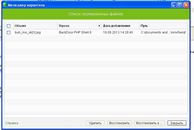 Это картинка - это мой скрин отчёта Доктора Вэба, когда он поймал вредоносную активность после того, как я начал лазить по вашему сайту. И естественно отправил (Др.Вэб) этот вирус в карантин. Вот скрин карантина я вам и выложил.