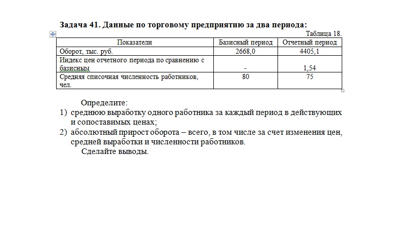2) абсолютный прирост оборота – всего, в том числе за счет изменения цен, средней выработки и численности работников.