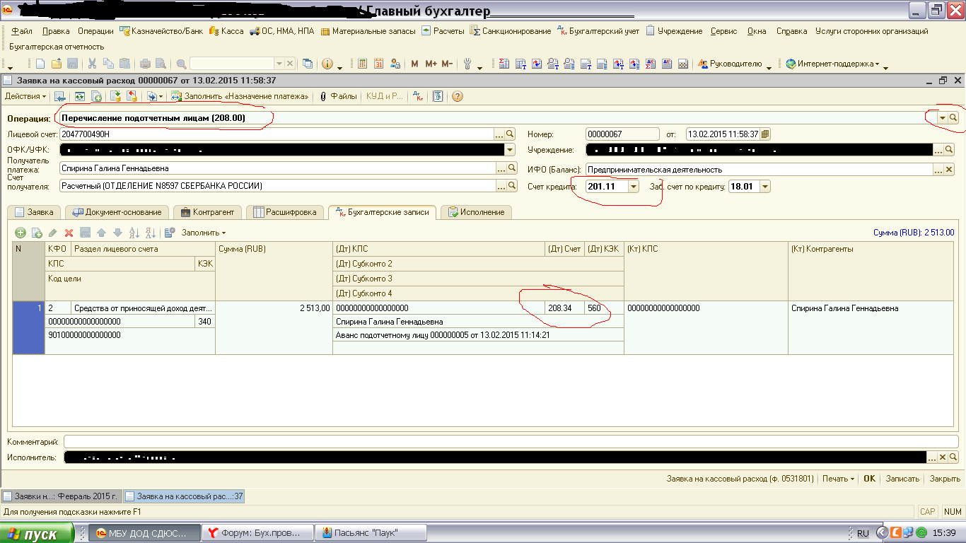 В заявке в верху когда выбираете операцию выберите Перечисление подотчетным лицам и все будет выбираться везде нормально. Без разницы или конткретно человеку или по реестру нескольким лицам Мы пишем в назначении платежа:а/о №5. заявление и приказ №39 от 13.02.2015г. зачисление по дог.№72006756 от 18.09.2007г.Иванову Ивану Ивановичу л/с ,,,,,,,,,,,,,,