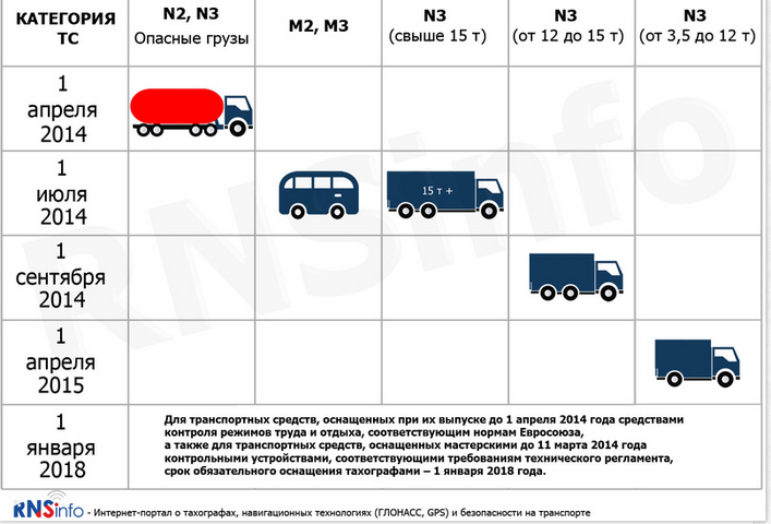 С 1 сентября 2014 года оснащению тахографами подлежат транспортные средства категории N3 (с общей максимальной массой от 12 тонн), используемые для перевозки грузов, не относящихся к опасным (за исключением транспортных средств с полной массой свыше 15 тонн, предназначенных для междугородных перевозок).