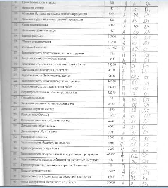 №17 Задолженность подотчетных лиц, им выдали деньги Д 71 К 50 т.е это Д и Актив. №18 Д 51 - это Актив. №37 К 76. №39 За кладовщиком что-то числится т.е это Д 73 и Актив. №40 Фонд - это скорее всего Пассив, не совсем понятно содержание и поэтому со счетом затрудняюсь. Скорее всего что-то из 80х счетов. И №8 не видно в сканах. |