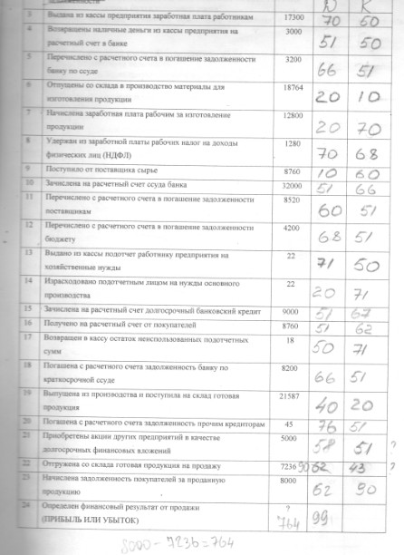 ![]() Следующая задача , это определение корреспонденции счетов не могли бы Вы проверить №22,23,24.... Особенно 24 интересует... порылась в интернете, прибыль или убыток считают так : К 90 минус Д90 ( минус ндс, но у нас ндс не указан ) в итоге получается 764 р прибыли... проводка Д 90 -9 К 99 верно?