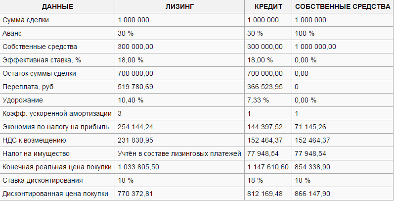 Формула расчета лизинговых платежей: Лизинговый платеж = основной долг + (проценты по кредиту + налог на имущество + прочие дополнительные затраты) * 1,18 (НДС) Данные из таблицы рассчитаны на 5 лет) Это главный показатель, который вы не указали в первом посте. . Первоначальная стоимость имущества составляет 1 лям руб. Аванс 30 % и удорожание 10,40 %, то составляющие будут выглядеть следующим образом: Сумма договора [1 519 780,69] = тело долга [700 тыс. руб.] + проценты по кредиту [391 346,18] + налог на имущество[47 925] + НДС[79 068,78] то есть реальная стоимость ресурсов составляет 18 % годовых. 700 штук понятно как получили да?! Проценты по кредиту рассчитать можно с помощью кредитного калькулятора, налог на имущество знаете как рассчитывать?! в % от остаточной стоимости имущества, только не забывайте, что при лизинге используется ускоренная амортизация с коэффициентом 3 (у вас в табличке указано кстати), налог на имущество получится 47925 )..... НДС: (391346,18+47925)*18%=79068,78, в общем все безобразие складывается и получается сумма договора 1519780,69, из нее вычитается 1 лям первоначальной стоимости, и получается переплата, что указана в таблице. Далее дело техники. Как рассчитывается налог на прибыль и ндс можно почитать в соответствующих разделах форума.