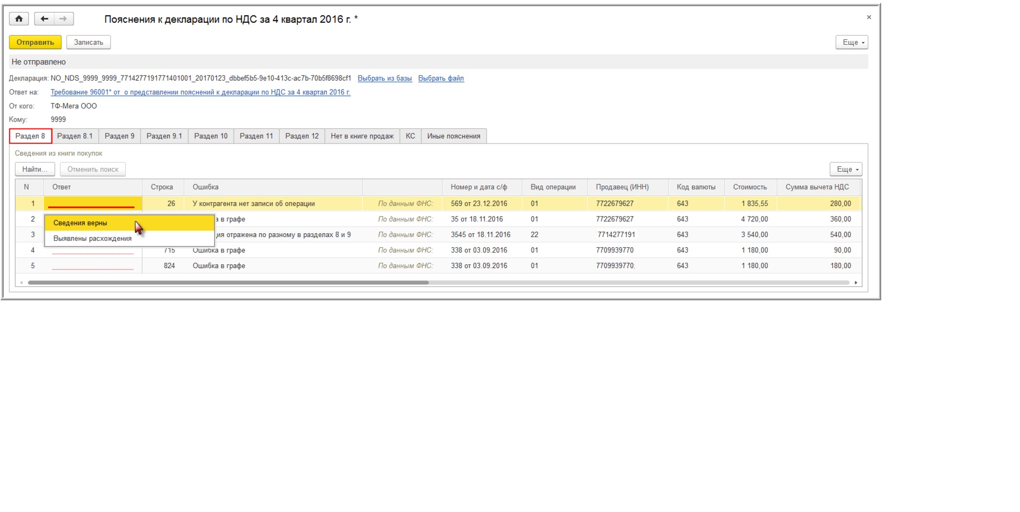 С/ф, про которые они пишут - это с/ф на аванс и с/ф на восстановление ндс с предоплаты. Никаких ошибок в декларации у меня нет и все с/ф отражены в 9 разделе и учтены при определении выручки. И я им поясняю, что предоплата получена тогда-то, отражена в книге продаж по такой-то строке, реализация тогда-то, восстановление ндс в книге покупок по такой-то строке.