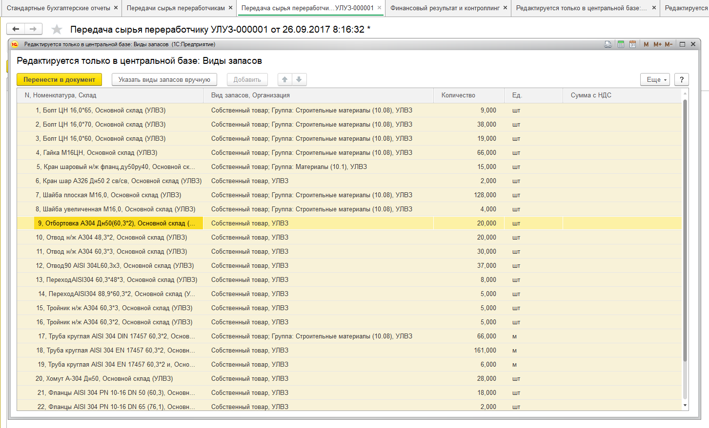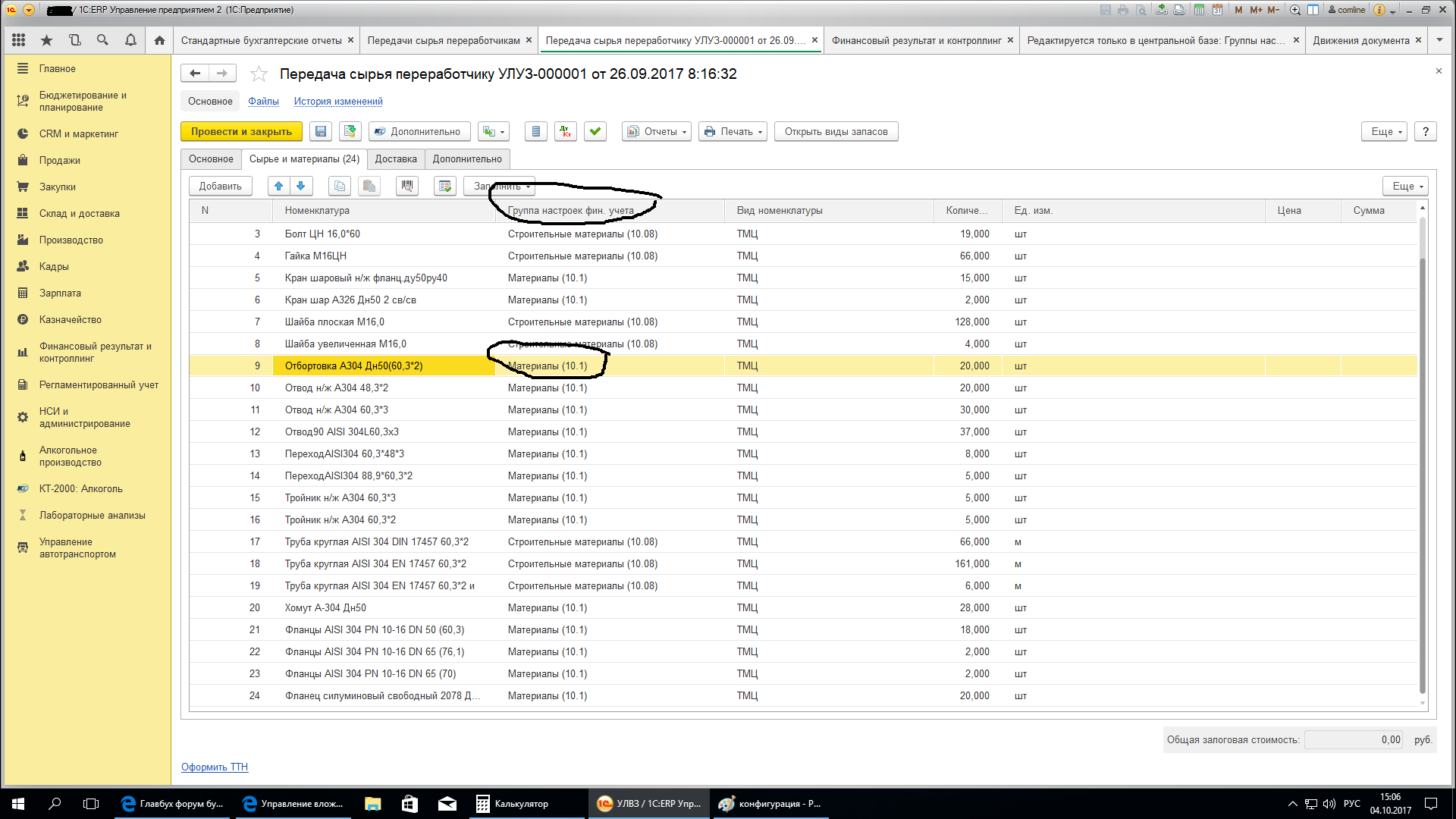1. Не пойму накой в документе передачи на переработку, где формируется только корреспонденция по балансовым счетам (Дт10.7 - Кт10е), указывается группа фин.учета расчетов?