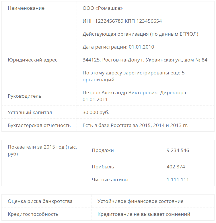 Ниже приведен пример сведений, получаемых при проверке контрагента этим сервисом. Полученная информация позволит нам не запрашивать отдельно отчетность за последние периоды, чтобы убедиться, что имеем дело не с фирмой-однодневкой. Покупателю это даст уверенность в том, что НДС, который вы приняли к вычету, будет подтвержден со стороны продавца.