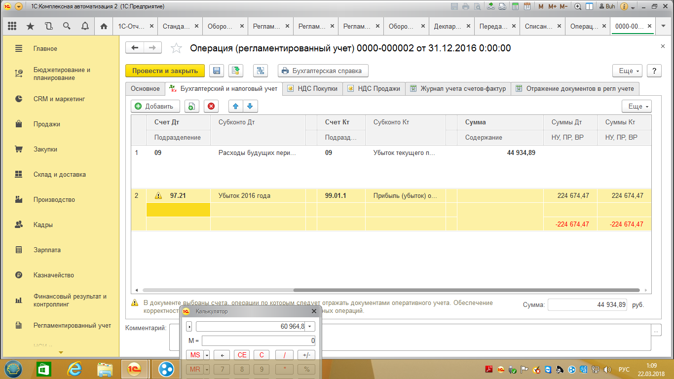 Добрый день, коллеги. Помогите - кто сталкивался с 1С КА 2.2?? интересует - как перенести убытки, понесенные в прошлом году, на прибыль текущегго года?