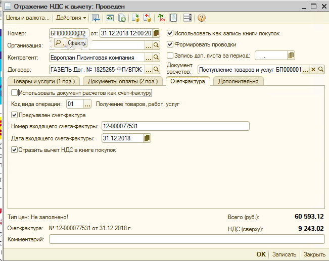 Предприятие (Лизингополучатель) по договору лизинга получило объект ОС и поставило на баланс. Отражаю в учете следующим образом: Дт 08 - Кт 60.01 Дт 01 - Кт 08 Дт 19 - Кт 60.01 -ндс Ежемесячная оплата по договору: Дт 60.02 - Кт 51 Дт. 60.01 - Кт 60.02 А вот дальше вопрос: Ежемесячно Лизингодатель выставляет акты и счета-фактуры на сумму актов. Акты отражать смысла не вижу. А вот как быть с НДС? На основании чего проводить счета-фактуры полученные? Спасибо. |