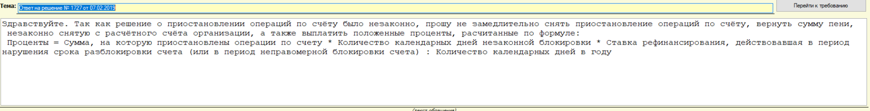 У меня несколько иначе было. Я оплатил требование давнишнее, а через несколько дней мне из налоговой по ТКС прислали решение, что они сами снимут эту сумму. Я им быстренько тем же путём написал вопрос, дескать, сумма будет снята повторно? Через несколько дней мне позвонили из налоговой. Спрашивали, как это повторно. Я ответил, что уже ранее оплатил сумму по требованию, а они ещё раз сняли. Обещали вернуть деньги и снять блокировку. Прождал неделю, никаких изменений не дождался. Накатал им через ТКС "записку куме" с просьбой уплатить проценты за незаконную блокировку счёта, даже формулу приложил. Ещё через несколько дней сняли блокировку, вернули деньги. А спустя ещё пару дней на счёт пришла непонятная сумма с интересным назначение платежа. Минут пять соображал, что же это за проценты, пока не понял, что как раз эта Гусарова и присылала эти требования и решения.