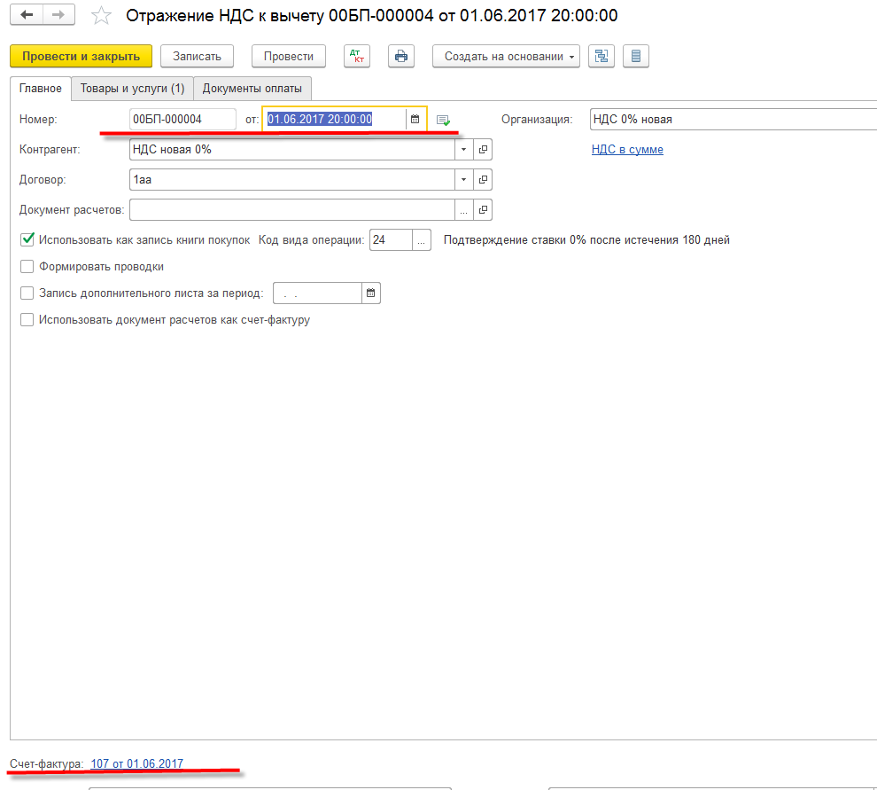 Добрый вечер. Бьюсь над этой проблемой уже 1 мес. Пробовала и так и эдак. Перерыла все методики. В книгу покупок вычет залетает в двойном размере, причем одна строка на полную сумму без указания контрагента и документа основания. Эта ошибка не дает заполниться корректно декларации. Подскажите у кого получилось провести в программе данные операции.