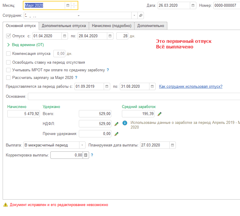В исправленном документе у меня меняется сумма начисленных отпускных! По виду, будто действительно начисляется отпуск за 37 дней. И при проведении программа не предупреждает о пересечении дней!