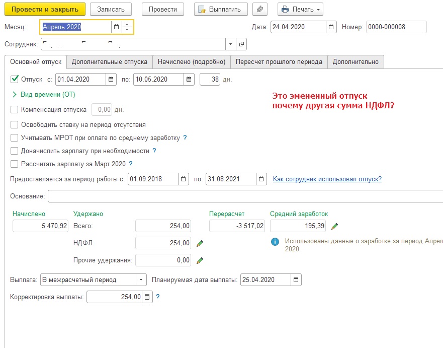 Делаем изменение начисления отпуска. Сумма начисления не меняется. 5470,92 и она уже выплачена. Но в проге понеслось сторнирование дохода... начисление... вычеты пересчитываются...