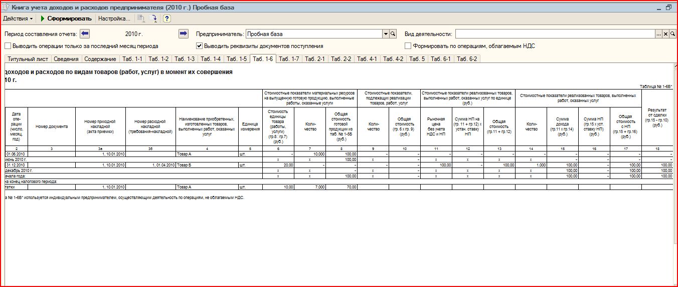 После оприходования товара А и Б 10.01.2010 г. и после реализации 01.04.20120 г. в Книге ДиР ничего не отобразилось. А вот после оплаты поставщику заполнились следующие листы А после того, как прошла оплата от покупателя, получилось следующее таблица 1-1 не изменилась, а остальные таблица стали такими И появился доход