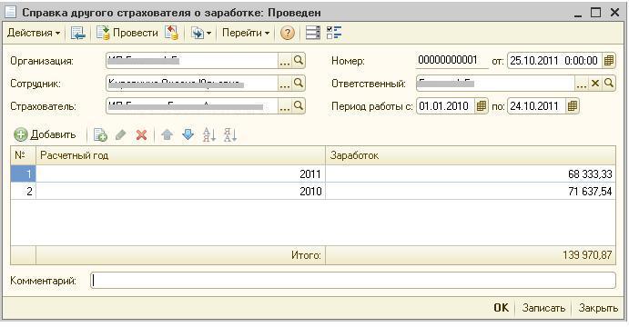 Сотрудник заболел в феврале 2012года. Расчётный период для начисления больничного будет 2010 и 2011гг. Сотрудник к нам устроился в середине октября 2011 года. За октябрь -декабрь 2011 года в нашей организации ему было начислена заработная плата 15666,67р. Сотрудник принёс справку с предыдущего места работы, где был указан его заработок за 2010г и за январь-октябрь 2011г на предыдущй работе. Я данные из этой справки ввела в документ "Справка другого страхователя о заработке" В табличную часть документа ввела две строки: 2010 год и сумму заработка за 2010 год у предыдущего работодателя 2011 год и сумму заработка за январь-октябрь2011г у предыдущего работодателя Далее ввела документ "Начисление по больничному листу" Но на закладке "Расчёт больничного листа" на закладке "Расчёт среднего заработка" программа заполняет только заработок, полученный сотрудником в нашей организации и не учитывает заработок с предыдущего места работы Почему документ "Начисление по больничному листу" не видит сумм из документа "Справка другого страхователя о заработке"? И не берёт данные из справки в расчёт среднего заработка? Что я делаю не так? Может ещё что-то нужно заполнить? программу обновила. Редакция 2.5.48.1 Последний раз редактировалось Lady Anna; 31.03.2012 в 22:04. |