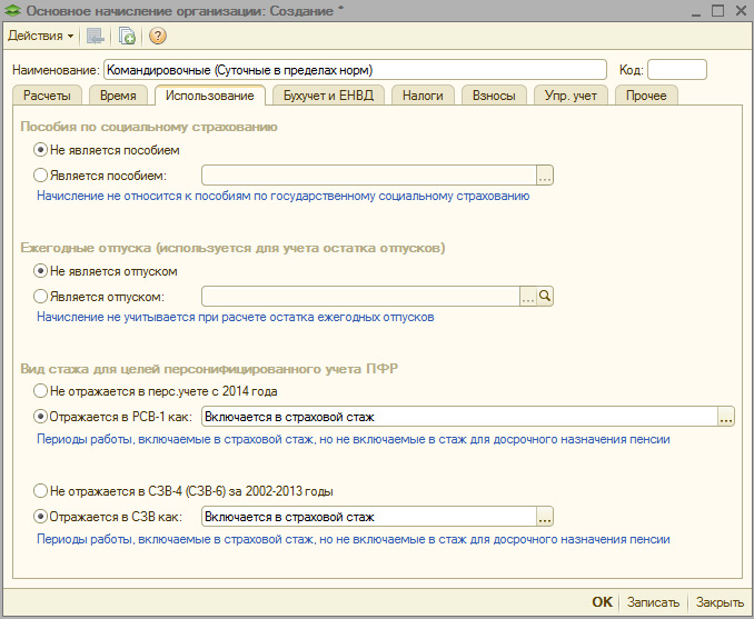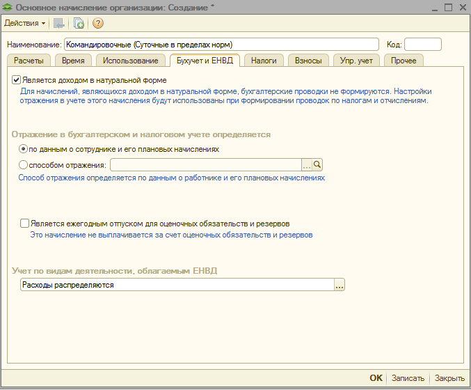 Пример Сотрудник организации Цветков О.П. находился в командировке на территории России с 13.11.2017 по 17.11.2017. Авансовый отчет по командировочным расходам сотрудника утвержден сразу после его возвращения из командировки, т.е. в ноябре 2017 г. В локальном нормативном акте организации установлено, что за каждый день нахождения сотрудника в командировке на территории России выплачиваются суточные в размере 700 рублей. Размер оплаты командировочных расходов составил 21 591 руб.: суточные – 3 500 руб.; расходы на проезд – 4 735 руб.; расходы на жилье – 12 456 руб.; другие расходы – 900 руб. (услуги связи). Необходимо зарегистрировать оплату командировочных расходов в пределах норм для отражения ее в отчетности по страховым взносам. Выполняются следующие действия: Настройка вида начисления. Начисление оплаты командировочных расходов в пределах норм. Настройка вида начисления Для начисления расходов по командировке в пределах норм, не облагаемых НДФЛ и страховыми взносами, в плане видов начислений (раздел Настройка – Начисления) должен быть создан новый вид начисления. В нашем примере будет создан вид начисления, с помощью которого будет начисляться общая сумма расходов по командировке. Если необходимо начислять расходы по каждому виду (например, суточные, расходы на жилье и т.д.), то для каждого вида расхода необходимо создать свой вид начисления. Нажмите на кнопку Создать. В поле Наименование заполните название вида начисления, в нашем примере – Командировочные расходы в пределах норм (рис. 1). В поле Код укажите код вида начисления (он должен быть уникальным). Флажок Начисление больше не используется устанавливается, если на предприятии данный вид начисления больше не используется. На закладке Основное: в разделе Назначение и порядок расчета в поле Назначение начисления выберите значение Доход в натуральной форме (для регистрации натурального дохода необходимо, чтобы в настройках расчета зарплаты (раздел Настройка – Расчет зарплаты – ссылка Настройка состава начислений и удержаний – закладка Прочие начисления) был установлен флажок Регистрируются натуральные доходы). Данное начисление не будет выплачиваться сотруднику на руки, но попадет в соответствующий раздел отчетов по заработной плате. Кроме того, бухгалтерские проводки по такому начислению не формируются. В поле Начисление выполняется автоматически будет указано значение По отдельному документу (такое начисление будет выполняться только по отдельному документу Доход в натуральной форме до окончательного расчета зарплаты); в разделе Расчет и показатели переключатель Результат вводится фиксированной суммой установлен по умолчанию. Рис. 1 6. На закладках Учет времени, Зависимости, Приоритет, Средний заработок используются значения, установленные программой по умолчанию. Единственное, на закладке Зависимости в табличной части Зависимые удержания по умолчанию отражается удержание по исполнительному документу. Данный вид удержания необходимо удалить. 7. На закладке Налоги, взносы, бухучет (рис. 2): в разделе НДФЛ установите переключатель в положение не облагается; в разделе Страховые взносы выберите – Доходы, целиком не облагаемые страховыми взносами, кроме пособий за счет ФСС и денежного довольствия военнослужащих. Рис. 2 8. На закладке Описание можно задать краткое наименова