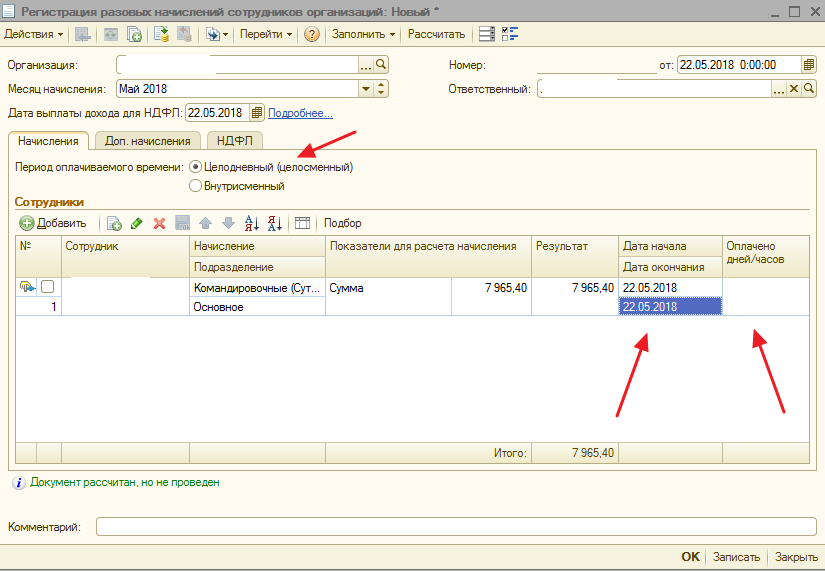 Начисление командировочных расходов производится с помощью документа Начисление зарплаты (раздел Зарплата и кадры – Зарплата – Все начисления) . В табличную часть по кнопке Добавить или Подбор добавьте сотрудника, по которому необходимо начислить оплату командировочных расходов. Выделив сотрудника, по кнопке Начислить выберите из списка ранее созданный вид начисления Командировочные расходы в пределах норм. В появившемся окне укажите сумму и нажмите на кнопку ОК. [свернуть]