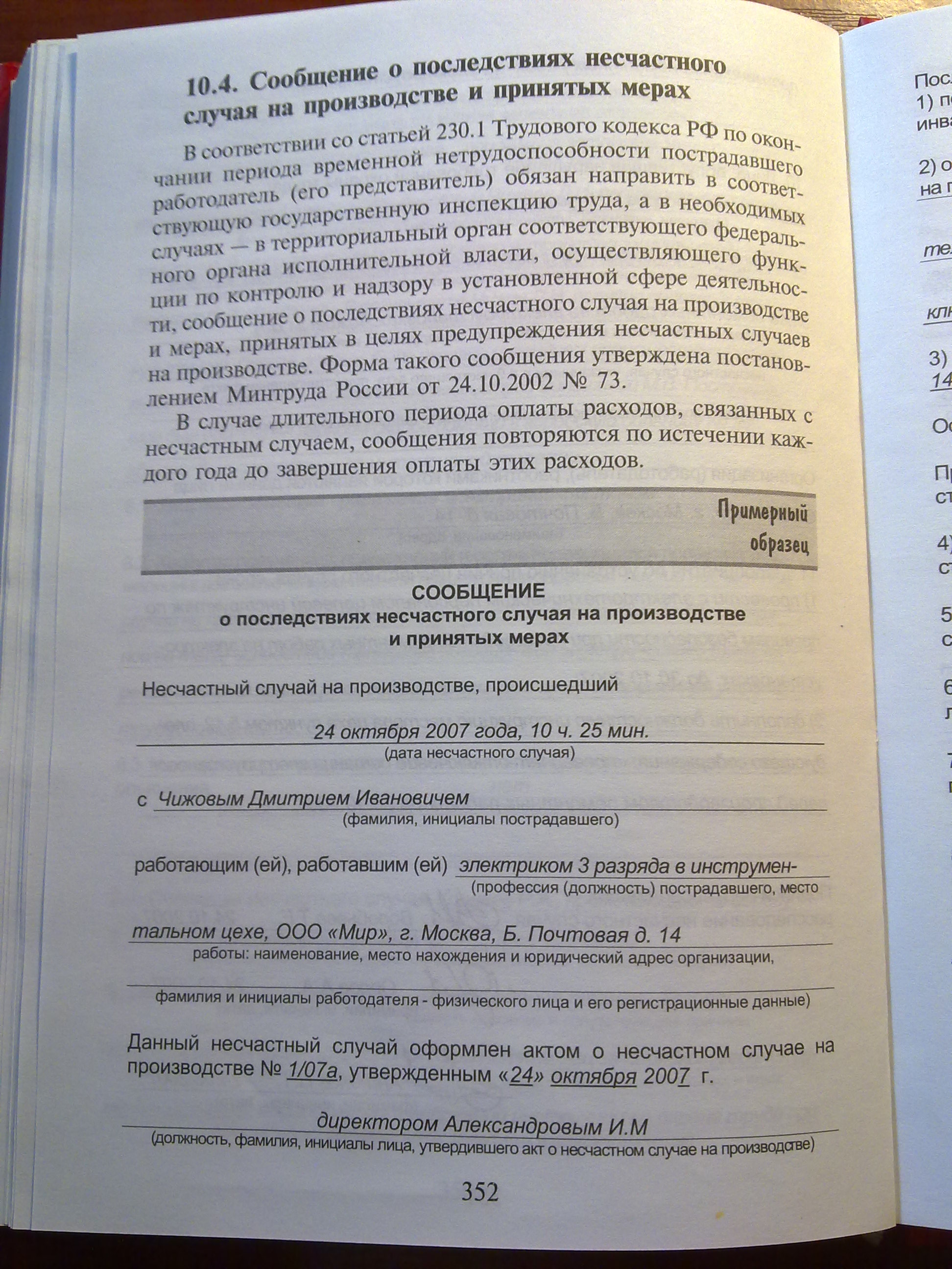 Таинственная Незнакомка, у меня есть книга, где очень подробно с описанием и примерами приведено расследование НС на производстве, вплоть до того как опрашивать пострадавшего, очевидцев и проч., даже бланки для образца заполнены. Если нужно сфоткаю и тебе перешлю. И еще. У меня был такой случай на производстве, довольно серьезный, человеку стружка металлическая в глаз отлетела и засела очень глубоко. Лежал в больнице, думали, что даже могут сделать операцию, но слава Богу, обошлось. Я все составила, но ни инспекцию, ни другие инстанции не оповещала, проблем не было.