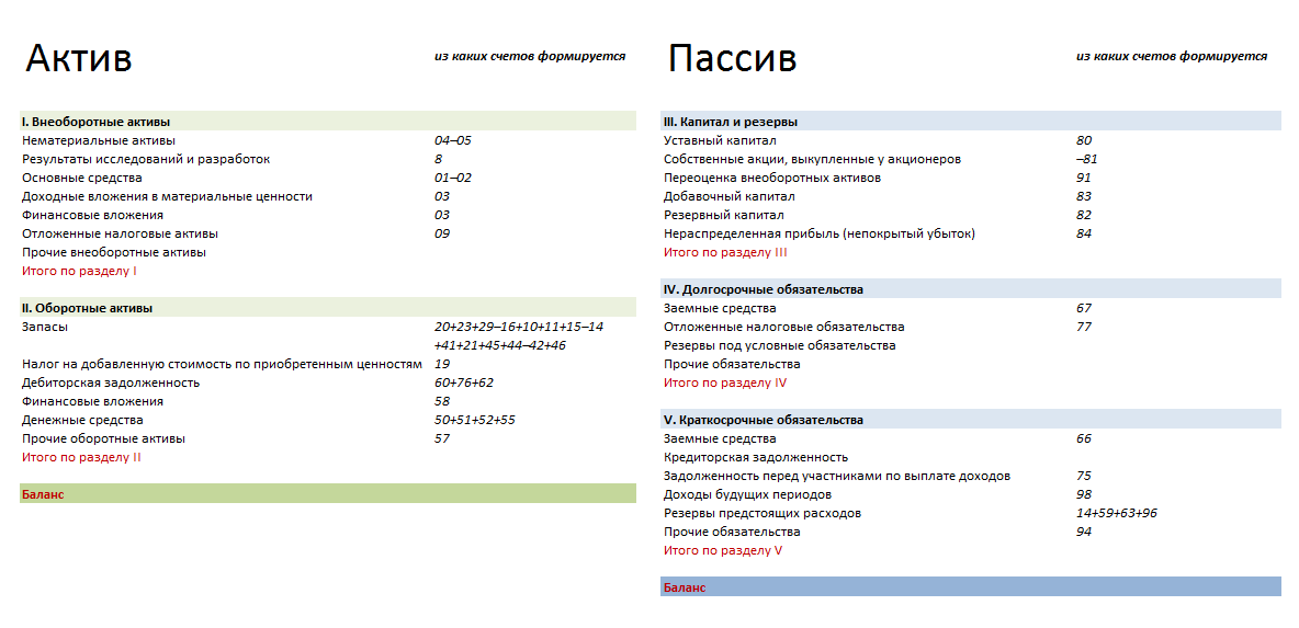 Нашел отличную . Вся теория подробно разжевана, но нигде не смог найти информации из каких счетов формируется баланс. Могу конечно сам это прикинуть, но не уверен, что нигде не ошибусь. Существует ли какая-нибудь методика формирования баланса или характеристика счетов?