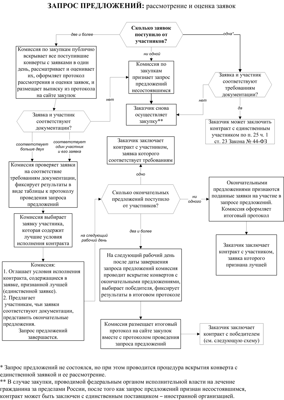 Запрос предложений – это один из способов определения поставщика (подрядчика, исполнителя). Победителем в нем становится тот, кто сможет предложить окончательные условия контракта, которые наилучшим образом удовлетворяют потребностям заказчика в товаре, работе или услуге. Случаи проведения Заказчик имеет право проводить запрос предложений в случаях: • покупки спортивного инвентаря, оборудования, экипировки для сборных команд России по олимпийским и паралимпийским видам спорта; • заключения контракта федеральным органом исполнительной власти с иностранной организацией на лечение гражданина за пределами России (в соответствии с Правилами, утвержденными постановлением Правительства РФ от 11 ноября 2013 г. № 1011); • заключения контракта взамен расторгнутого заказчиком в одностороннем порядке. Если до расторжения контракта контрагент частично исполнил свои обязательства, количество товара (объема работ, услуг) необходимо уменьшить с учетом выполненных обязательств. Цену в таком случае также уменьшите пропорционально количеству товара (объему работы, услуги); • заключения контракта на поставку лекарств, назначенных пациенту по решению врачебной комиссии при наличии медицинских показаний (индивидуальная непереносимость других препаратов, по жизненным показаниям). В этом случае количество закупаемых препаратов, которые нужны пациенту, рассчитывается исходя из всего срока его лечения. Для лечения каждого пациента следует заключать отдельный контракт. Сведения о таком контракте внесите в реестр контрактов вместе с решением врачебной комиссии, а персональные данные пациента обезличьте; • признания повторного конкурса, электронного аукциона несостоявшимися; • приобретения изделий народных промыслов признанного художественного достоинства, образцы которых зарегистрированы в соответствии с Правилами, утвержденными постановлением Правительства РФ от 18 января 2001 г. № 35; • приобретения услуг российских и иностранных специалистов, экспертов и адвокатов по защите интересов страны при подаче исков гражданами или организациями в судебные органы иностранных государств, международные суды и арбитражи к России. Данный перечень приведен в части 2 статьи 83 Закона от 5 апреля 2013 г. № 44-ФЗ. Порядок проведения запроса предложений Определение поставщика (подрядчика, исполнителя) путем проведения запроса предложений проходит следующие стадии: • подготовка к проведению запроса предложений; • рассмотрение и оценка заявок на участие в запросе предложений; • рассмотрение окончательных предложений. Подготовка к проведению Решение о проведении запроса предложений принимает заказчик, а при централизации закупок – уполномоченный орган, уполномоченное учреждение (ч. 5 ст. 24, ст. 26 Закона от 5 апреля 2013 г. № 44-ФЗ). Перед проведением запроса предложений заказчик создает комиссию по проведению закупок. При этом заказчик вправе создать как специализированную комиссию, так и единую, уполномоченную определять поставщика любыми способами (ст. 39 Закона от 5 апреля 2013 г. № 44-ФЗ). Извещение о проведении запроса предложений и информацию о требующихся товарах, работах или услугах опубликуйте на официальном сайте . Внимание: если из-за технических сбоев на официальном сайте () невозможно опубликовать информацию о проведении закупки, сделат