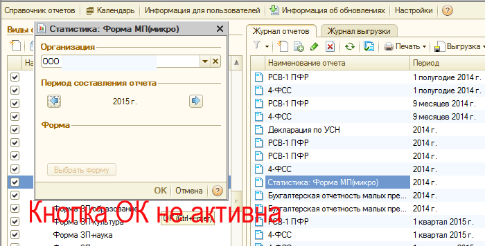 Стала создавать форму МП (микро) в Росстат, за 2015 год. Форма стала не активной, при создании выбирая 2015 год , кнопка ок не активна и не указано название формы. За 2014 год форму создали без проблем. Никаких изменений учётной политике в программе мы не делали, декларацию, баланс всё заполнили без проблем Прикладываю фотографии. Пожалуйста подскажите в чем дело. С уважением, Людмила |